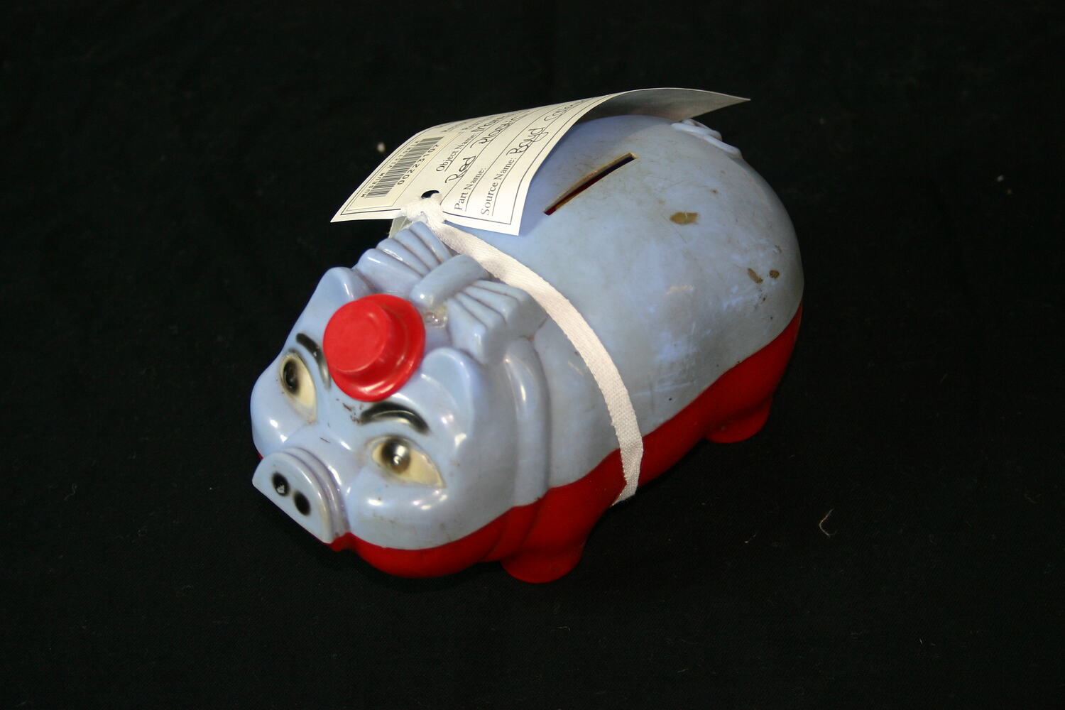 Large blue/red plastic pig money box.