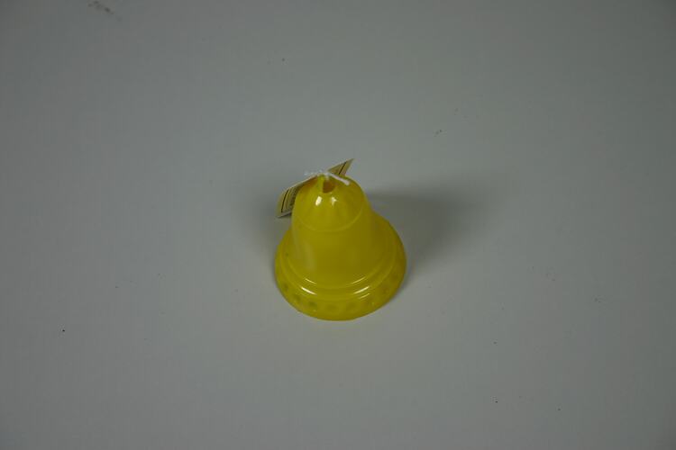 Yellow plastic christmas ornament in the shape of a bell.