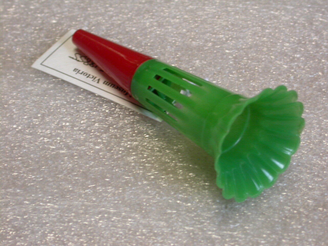 Christmas decoration in the shape of a red and green plastic trumpet. Can be blown like a whistle.