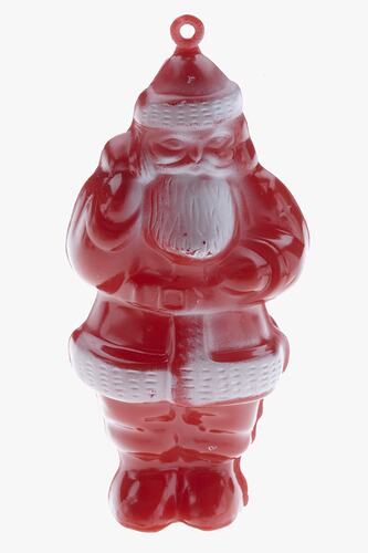 Christmas decoration of Santa Claus figure moulded from red plastic with white paint.