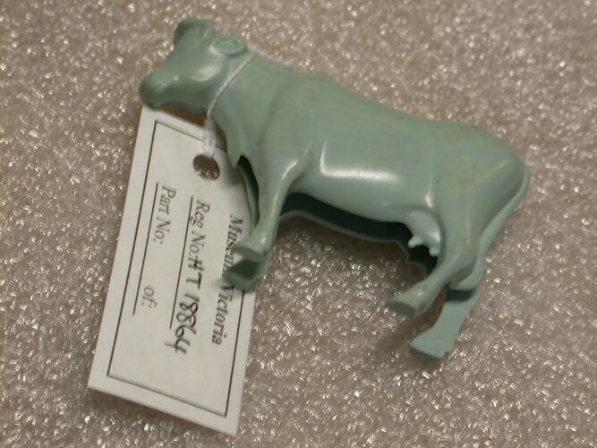 Light blue plastic toy cow standing.