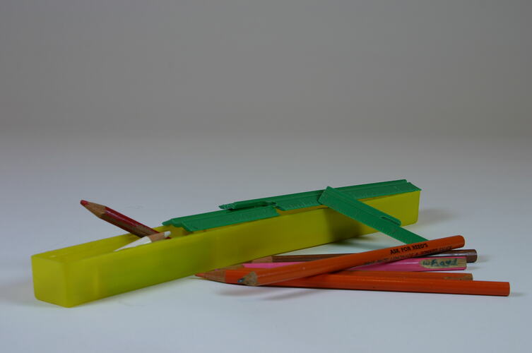 Yellow plastic pencil box with green plastic ruler serving as slide top. Contains coloured pencils.