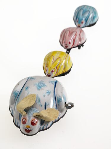 'Train' of four Rabbits, metal, articulated. Large white and blue front rabbit with rubber ears and clockwork mechanism (enclosed) with key. Followed by three smaller rabbits coloured yellow, pink and blue.