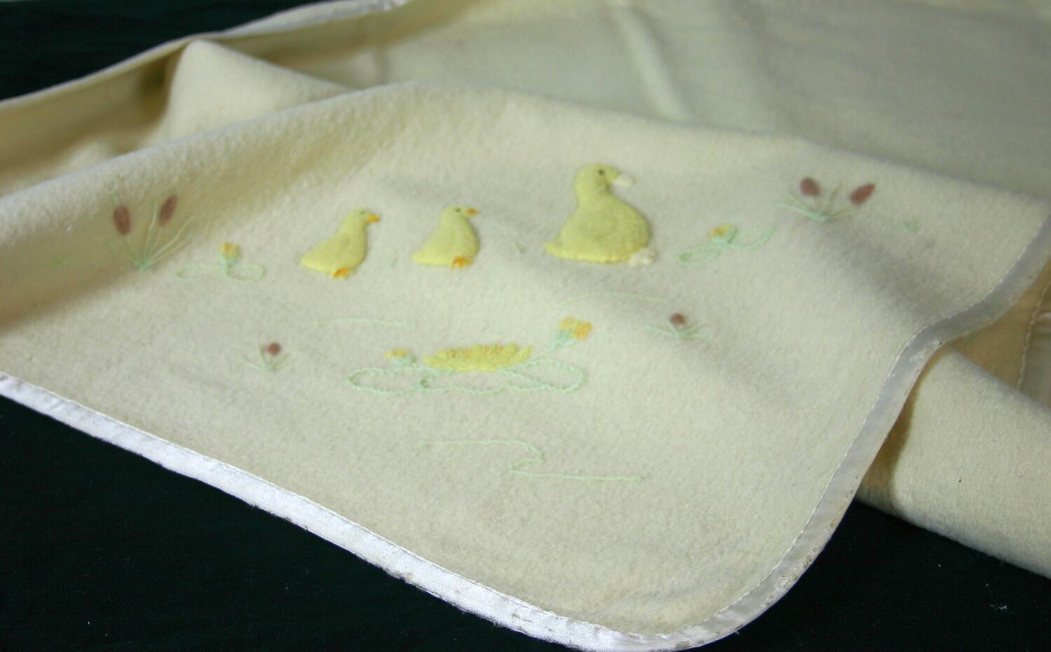 Cream wool baby blanket decorated with three yellow ducks and flowers.