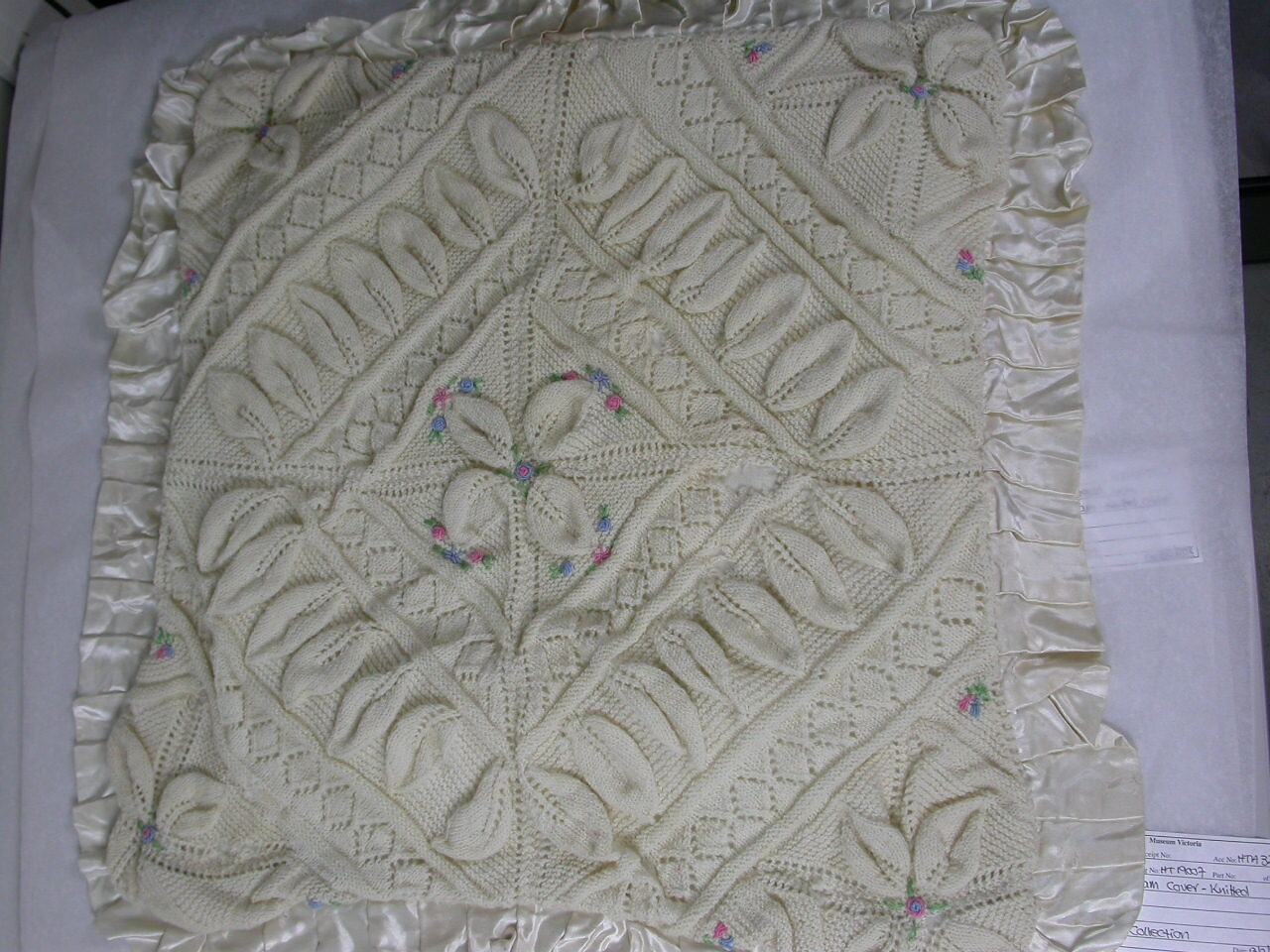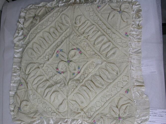 Pram coverlet, of wool in a textured weave with machine shell edging.