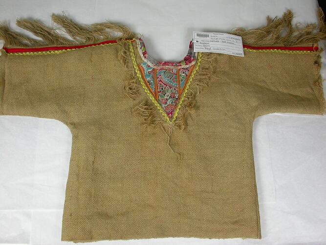 Shirt based on a Native American costume, circa 1950s. It is a child's costume, homemade from hessian Colonial Sugar bags, and was used and owned by Bill Boyd in the 1950s.