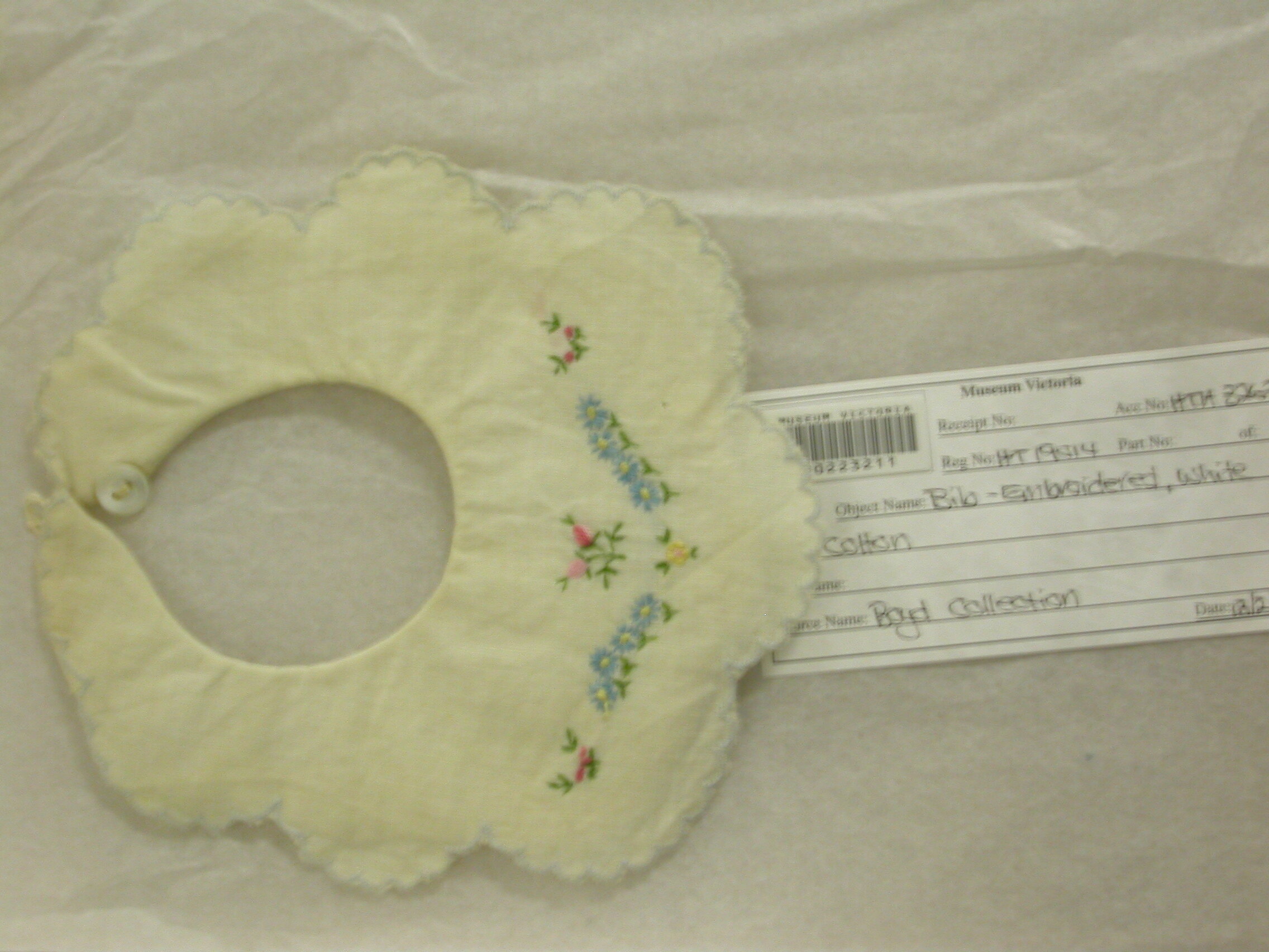 White cotton embroidered bib. Worn by Bill Boyd in the late 1940s.