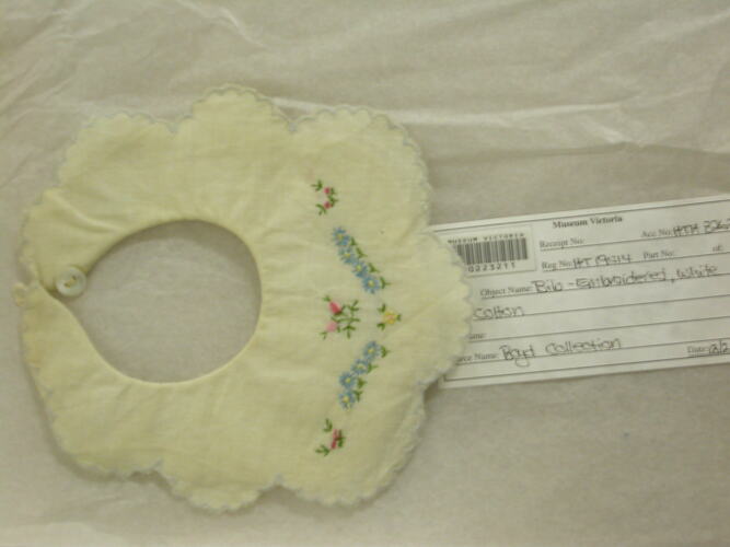 White cotton bib with embroidered flowers in shades of blue, yellow and pink with green leaves.