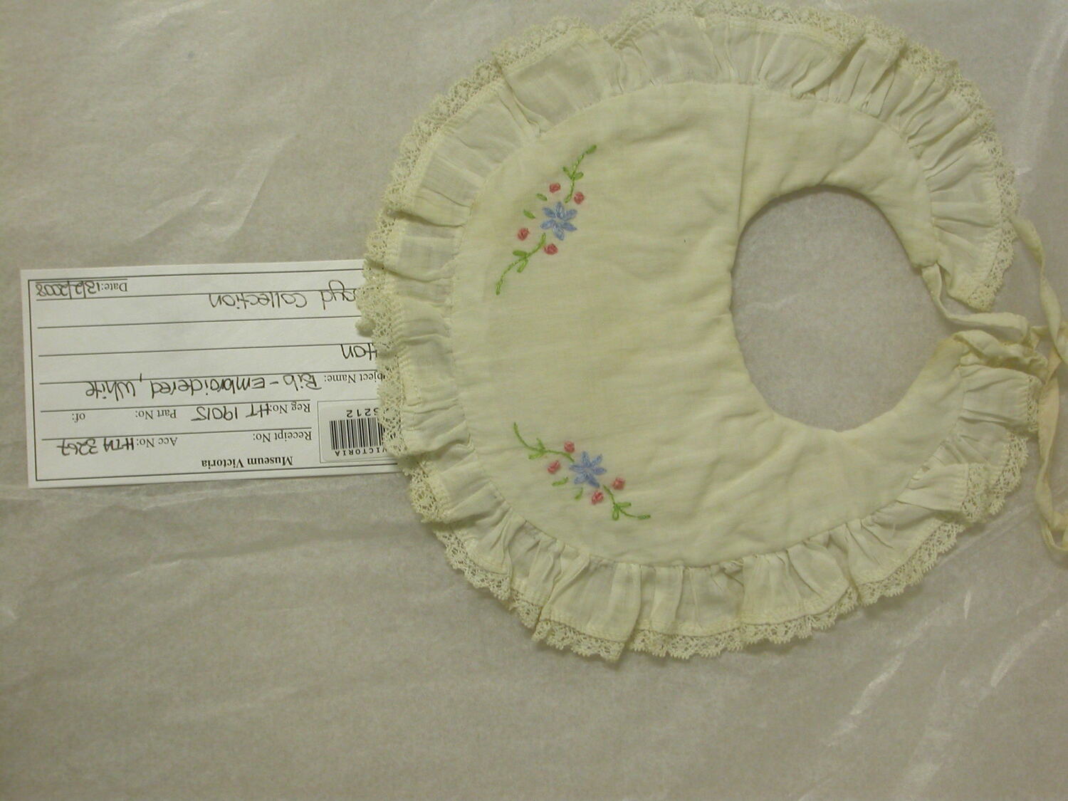 White cotton bib embroidered with floral design in shades of blue, pink and green with lace trim.