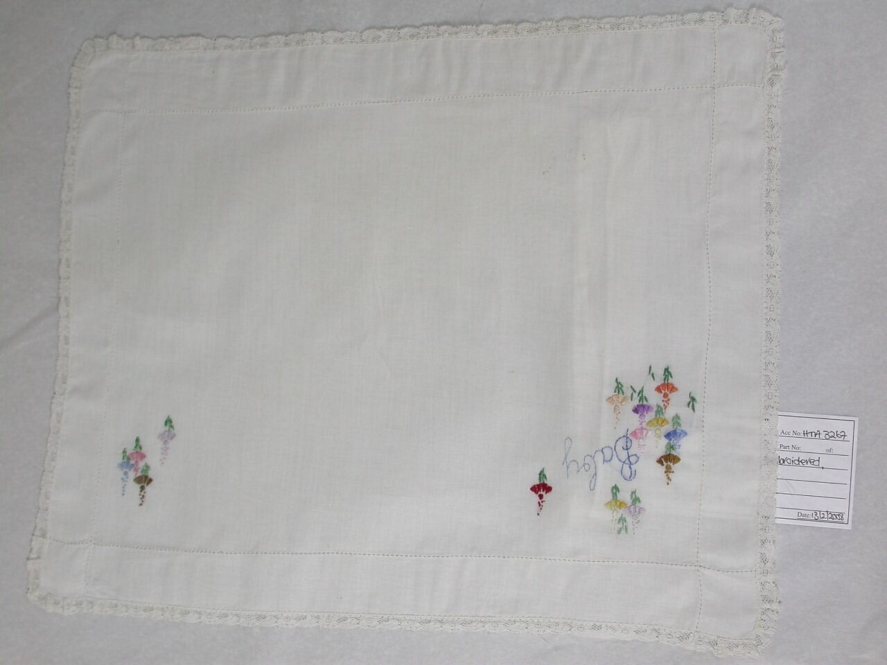 White cotton pillowcase with lace border. Embroidered with blue text, multicoloured flowers with green leaves.