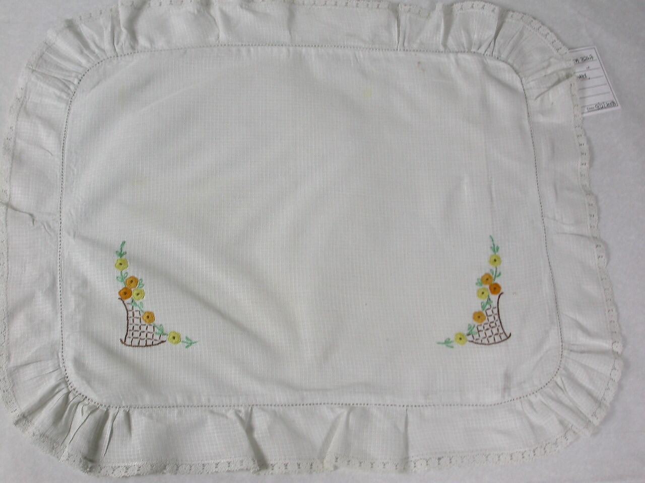 White cotton pillowcase with lace border. Embroidered with orange and yellow flowers with green leaves.
