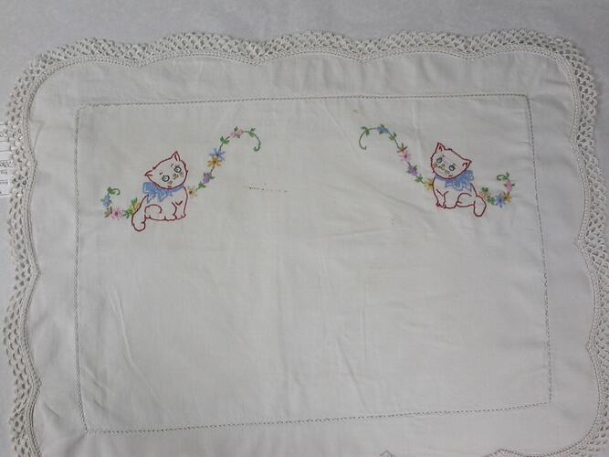 White cotton pillowcase with lace border. Multicoloured embroidery of red cats with blue bows surrounded by flowers.