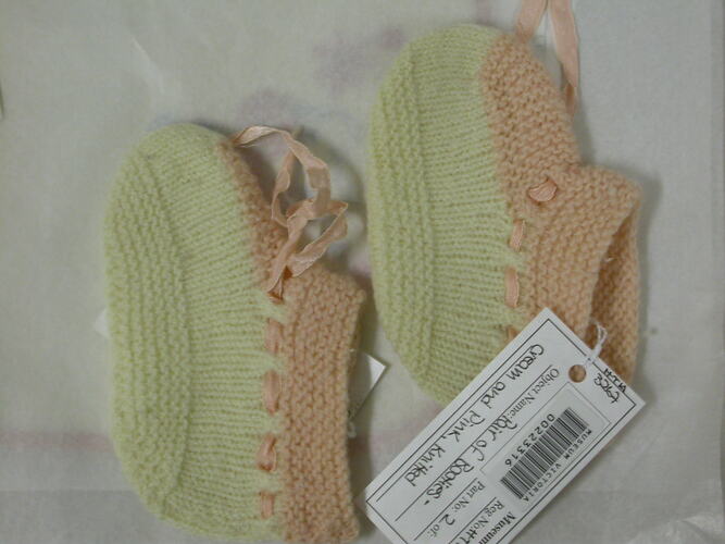 Pair cream knitted booties with pink ankle border and pink slotted ribbon.