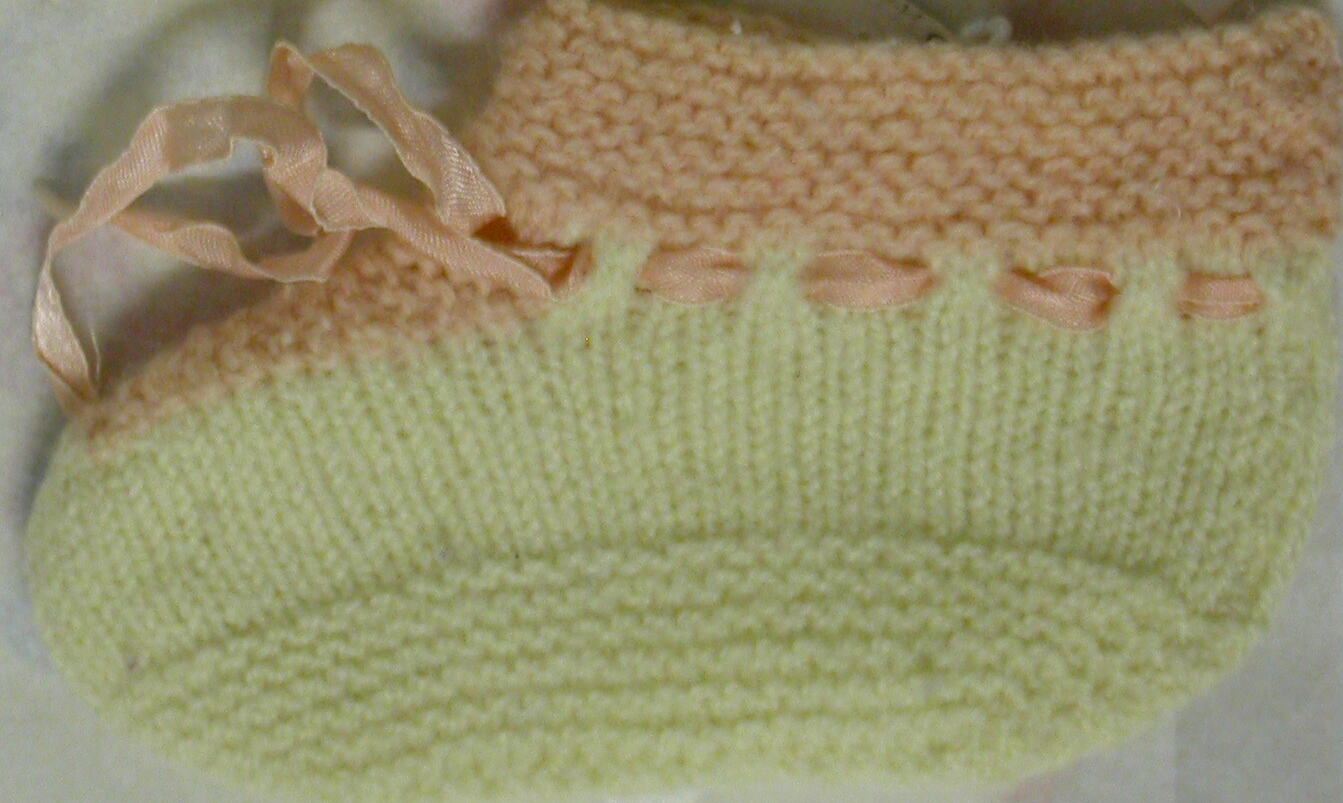 Cream knitted bootie with pink ankle border and pink slotted ribbon.