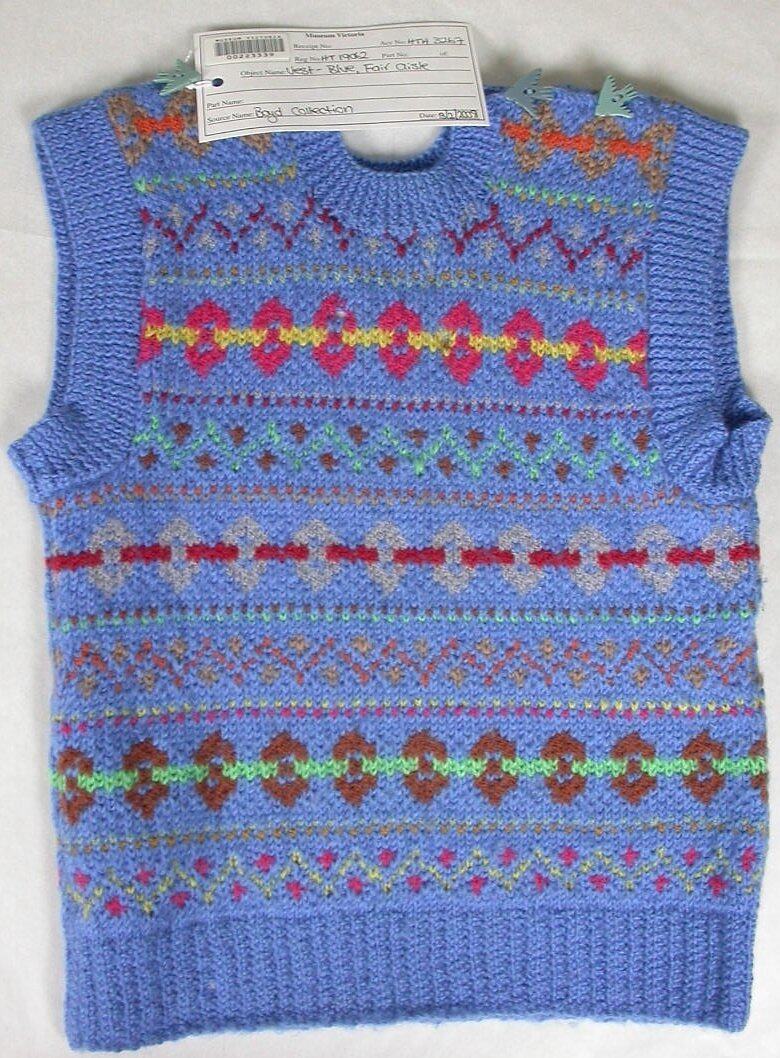 Boy's sleeveless pullover with shoulder fastening. Handknitted in fair aisle pattern. Main colour blue.