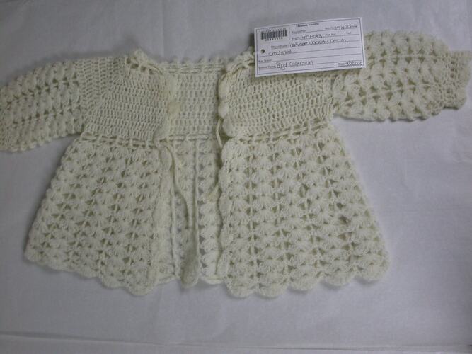 Cream crocheted matinee jacket. Worn by Bill Boyd in the late 1940s.