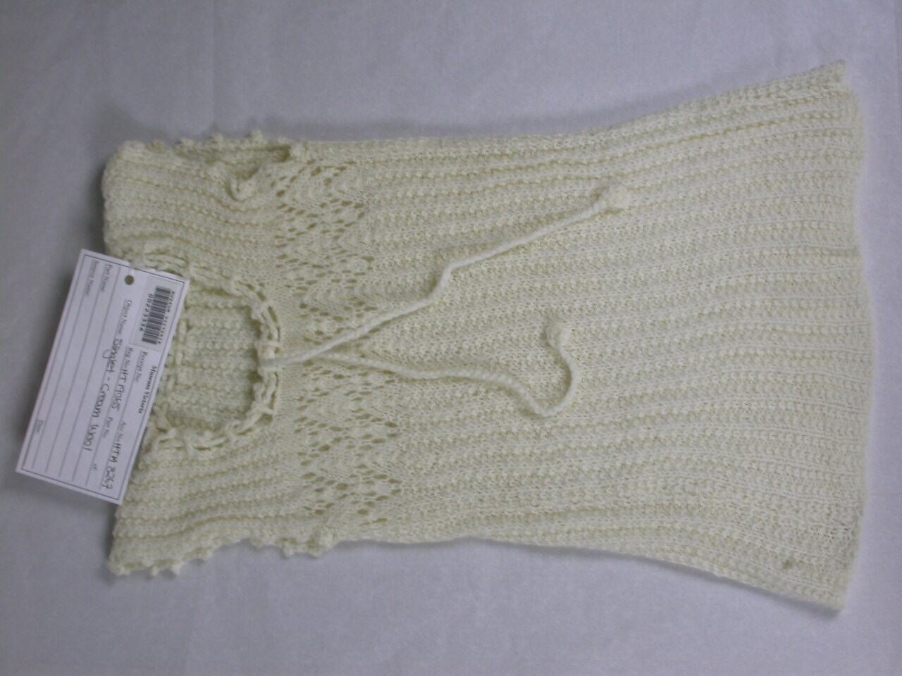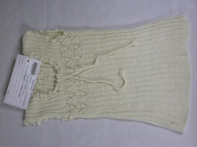 Infant's singlet, handknitted in cream wool. Rib stitch with lace stitch upper front. Drawstring neck line. Tape bottom edge marked L. BOYD.