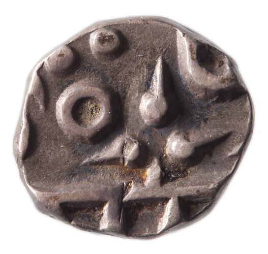 A legend in Persian script, almost all off flan; partly on the flan at the left, the right side of a bow and arrow pointing down; partly on flan at the right, and left side of the Sanskrit character 'Ji' (fo Jayaji)