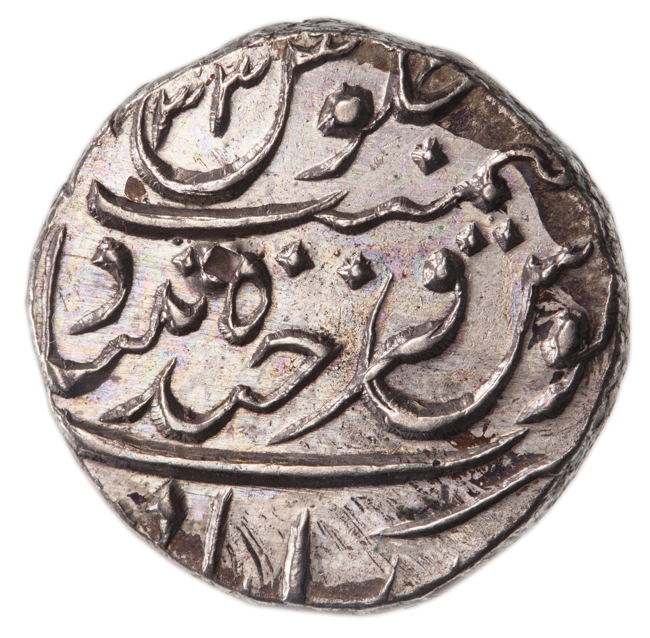 A legend in Persian script, partly off flan; with Regnal year 33 near edge at 11 o'clock