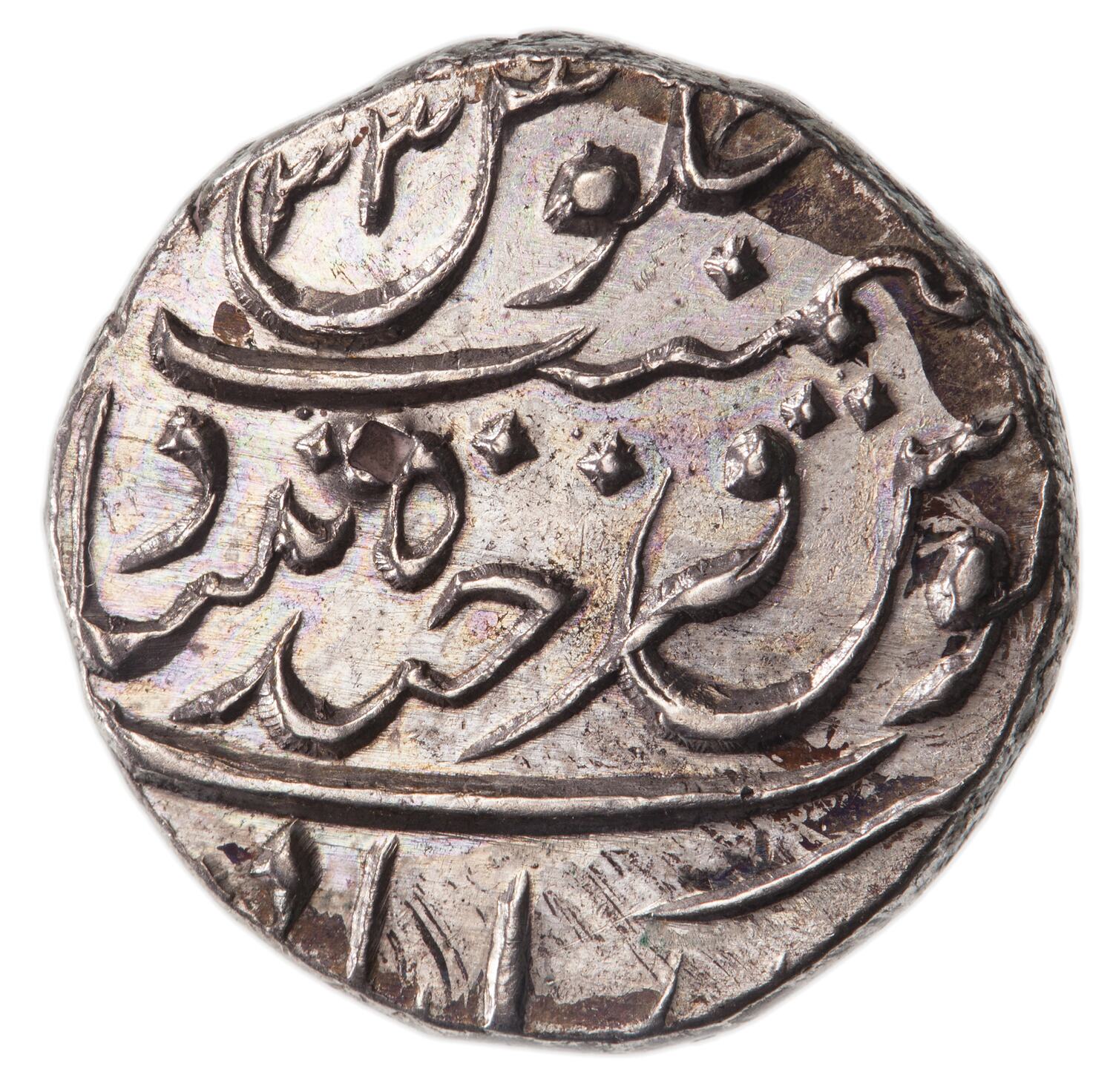 A legend in Persian script, partly off flan, giving the ruler's name and title: Asaf Jah, Nizam al-Mulk; at bottom of flan the Hejira date in Hyerbad numerals, 1317 (numeral 7 over 6)