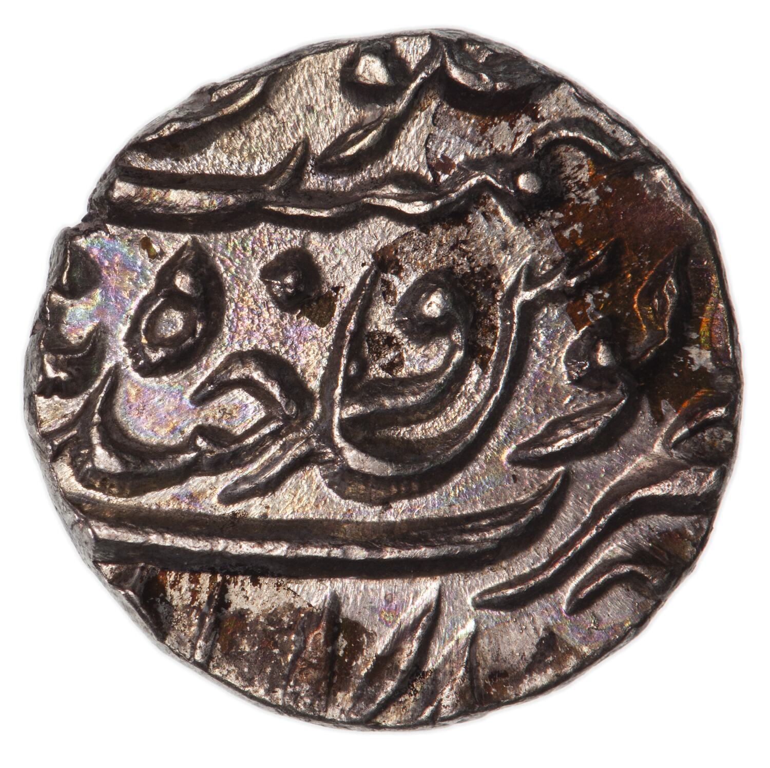 A legend in Persian script, partly off flan, giving the ruler's name and title: Asaf Jah, Nizam al-Mulk; at bottom of flan the Hejira date in Hyerbad numerals, 1308