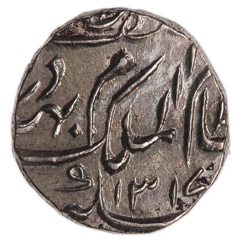 A legend in Persian script, partly off flan, giving the ruler's name and title: Asaf Jah, Nizam al-Mulk; at bottom of flan the Hejira date in Hyerbad numerals, 1317