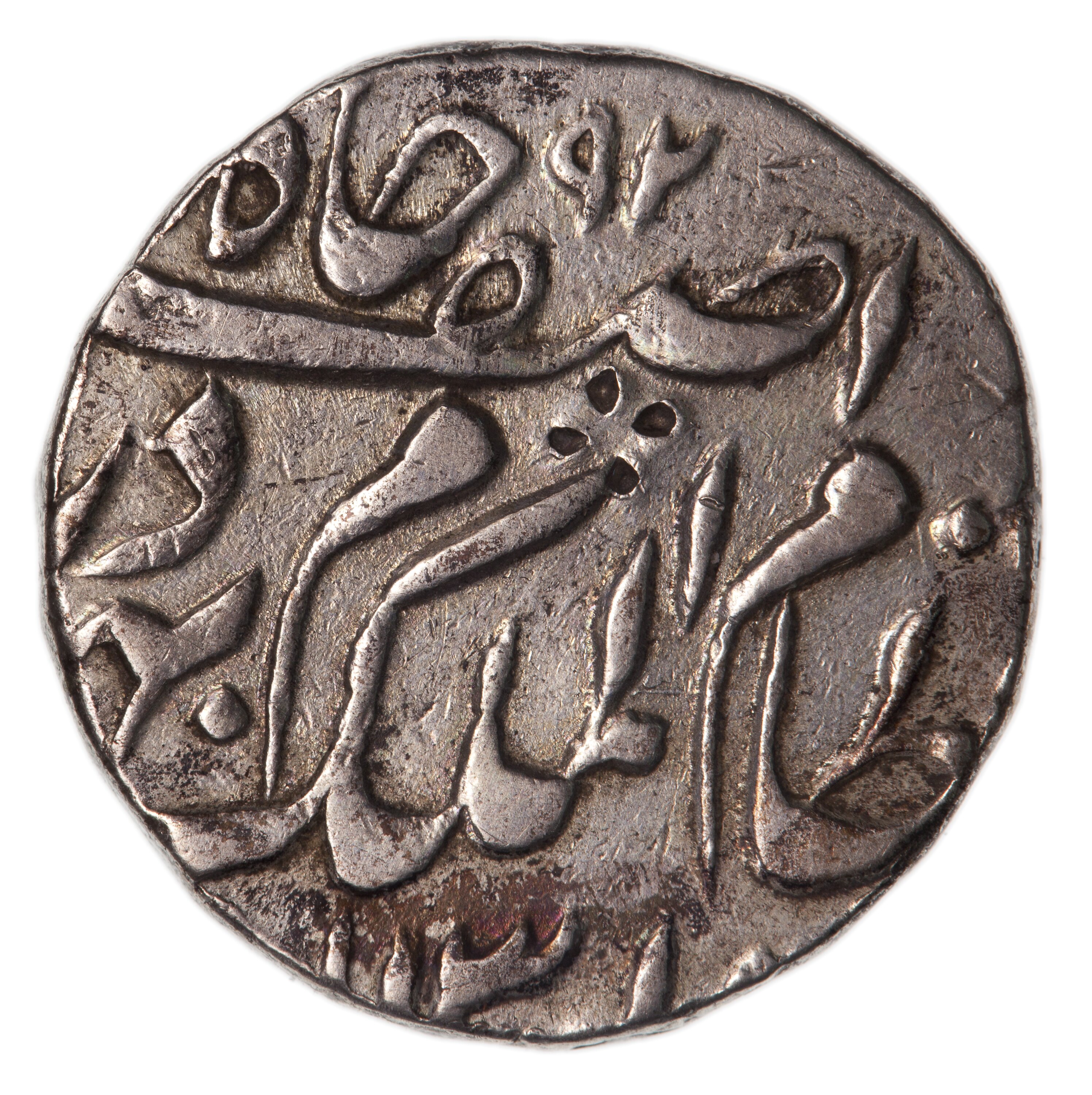 A legend in Persian script, partly off flan, giving the ruler's name and title: Asaf Jah, Nizam al-Mulk; at bottom of flan the Hejira date in Hyerbad numerals, 1310