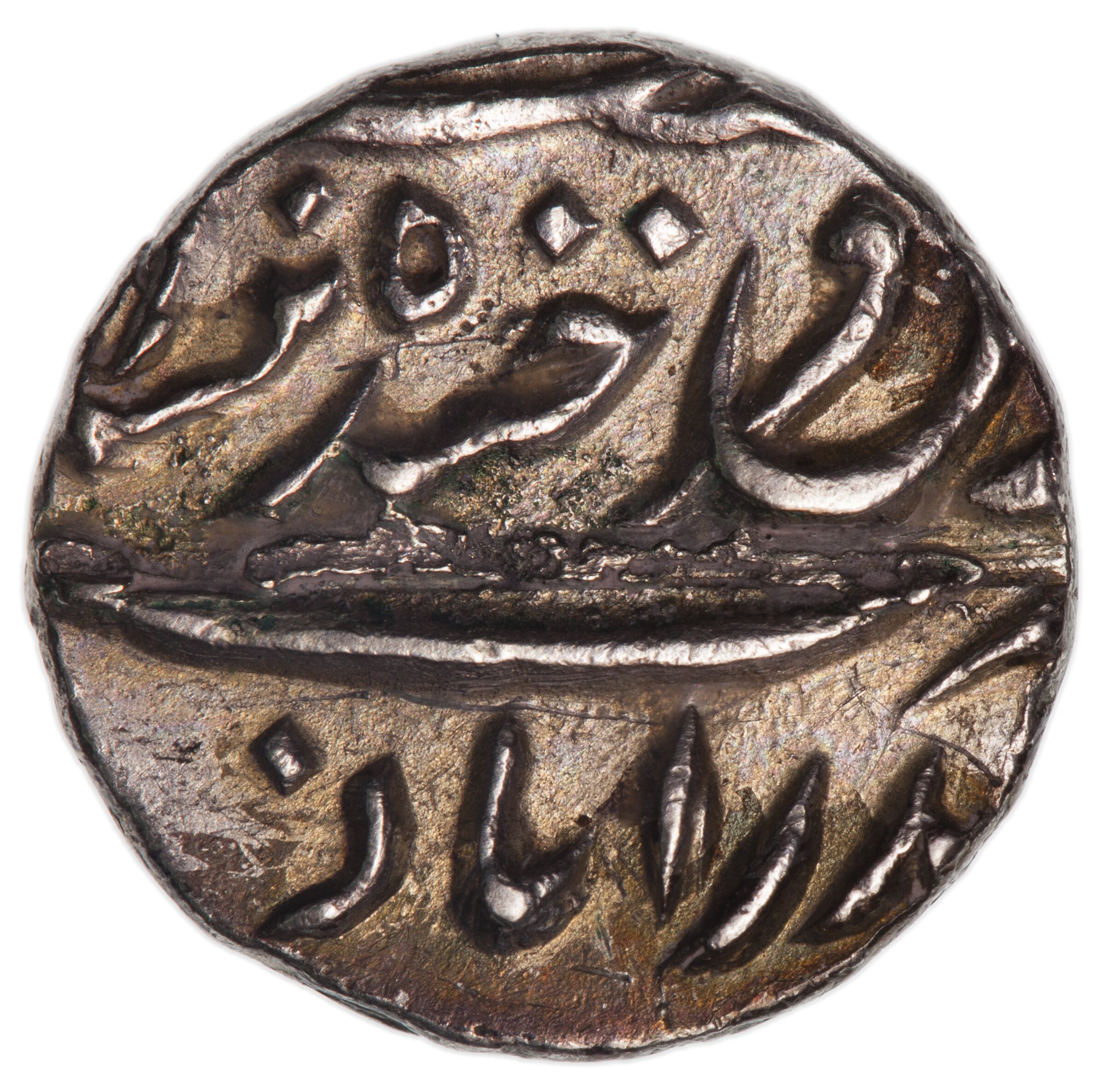 A legend in Persian script, partly off flan, giving the ruler's name and title: Asaf Jah, Nizam al-Mulk; at bottom of flan the Hejira date in Hyerbad numerals, 1307