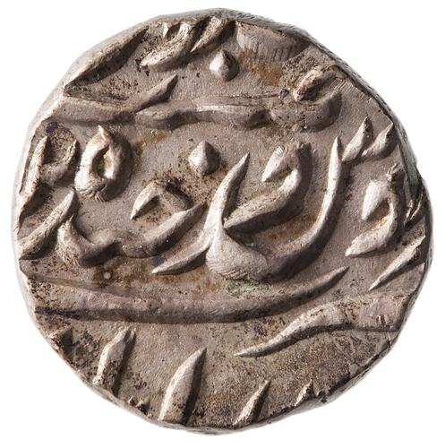 A legend in Persian script, partly off flan, giving the ruler's name and title: Asaf Jah, Nizam al-Mulk; at bottom of flan the Hejira date in Hyerbad numerals, 1307