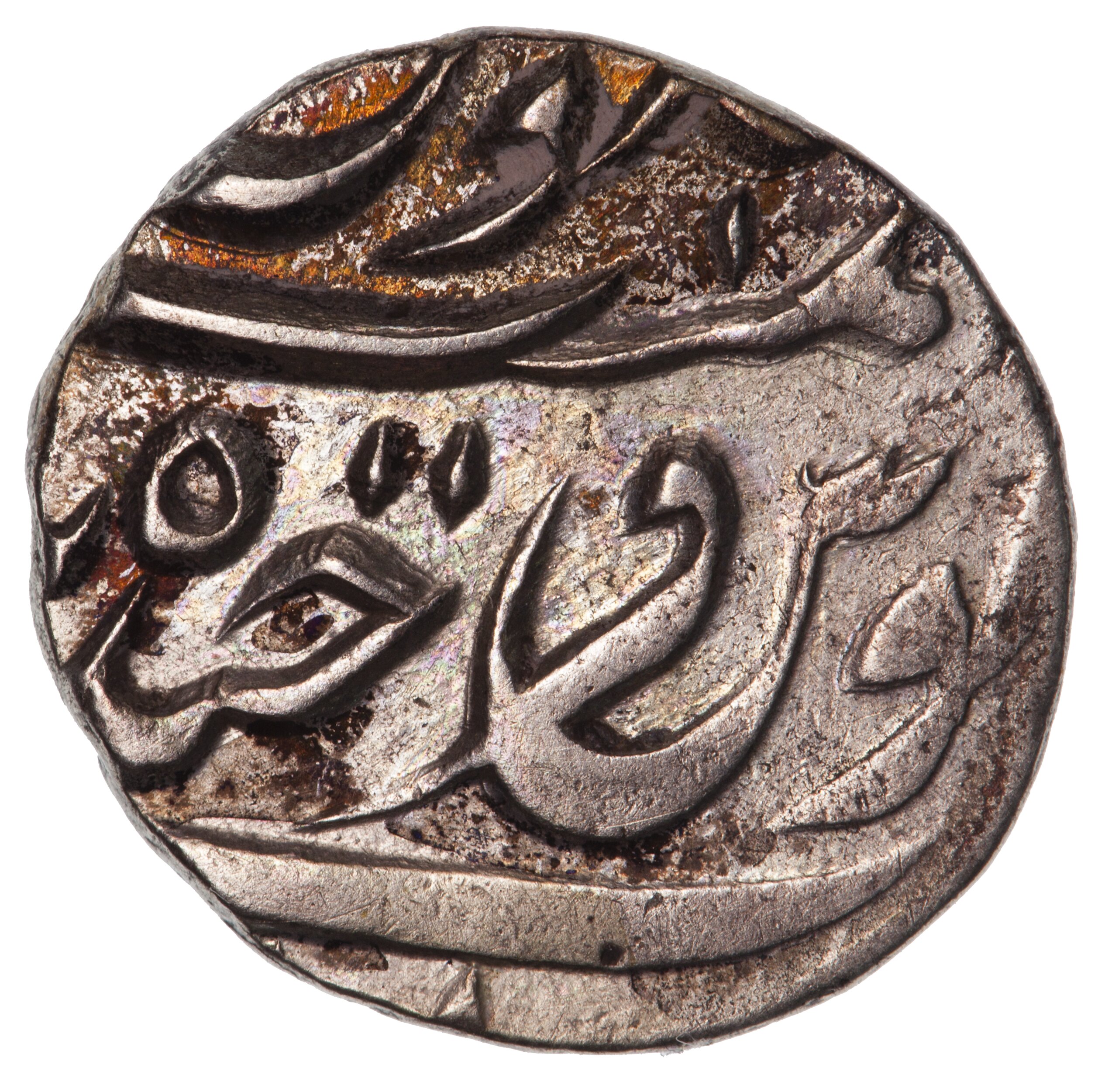 A legend in Persian script, partly off flan, giving the ruler's name and title: Asaf Jah, Nizam al-Mulk; at bottom of flan the Hejira date in Hyerbad numerals, 129[?] last numeral off flan