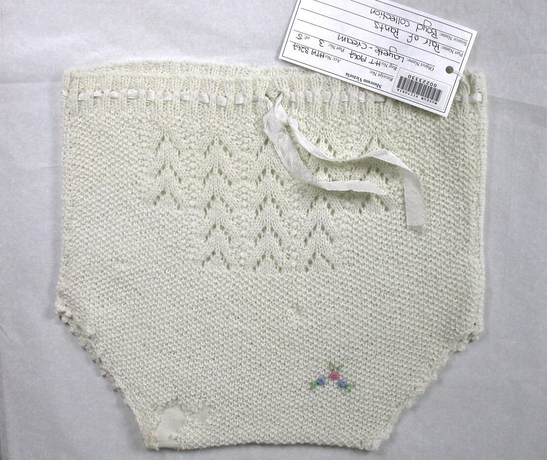 Infant's hand knitted dress, matinee jacket, pants, and bonnets(1 ribbon,1knitted ties). All items cream wool with lace stitch pattern & rosebud motifs.
