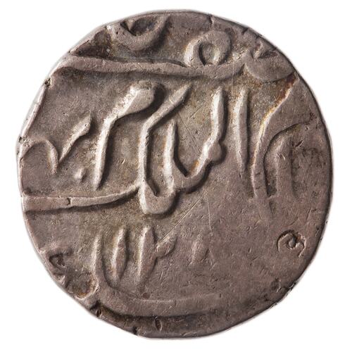 A legend in Persian script, partly off flan, giving the ruler's name and title: Asaf Jah, Nizam al-Mulk; at bottom of flan the Hejira date in Hyerbad numerals, 128[?]