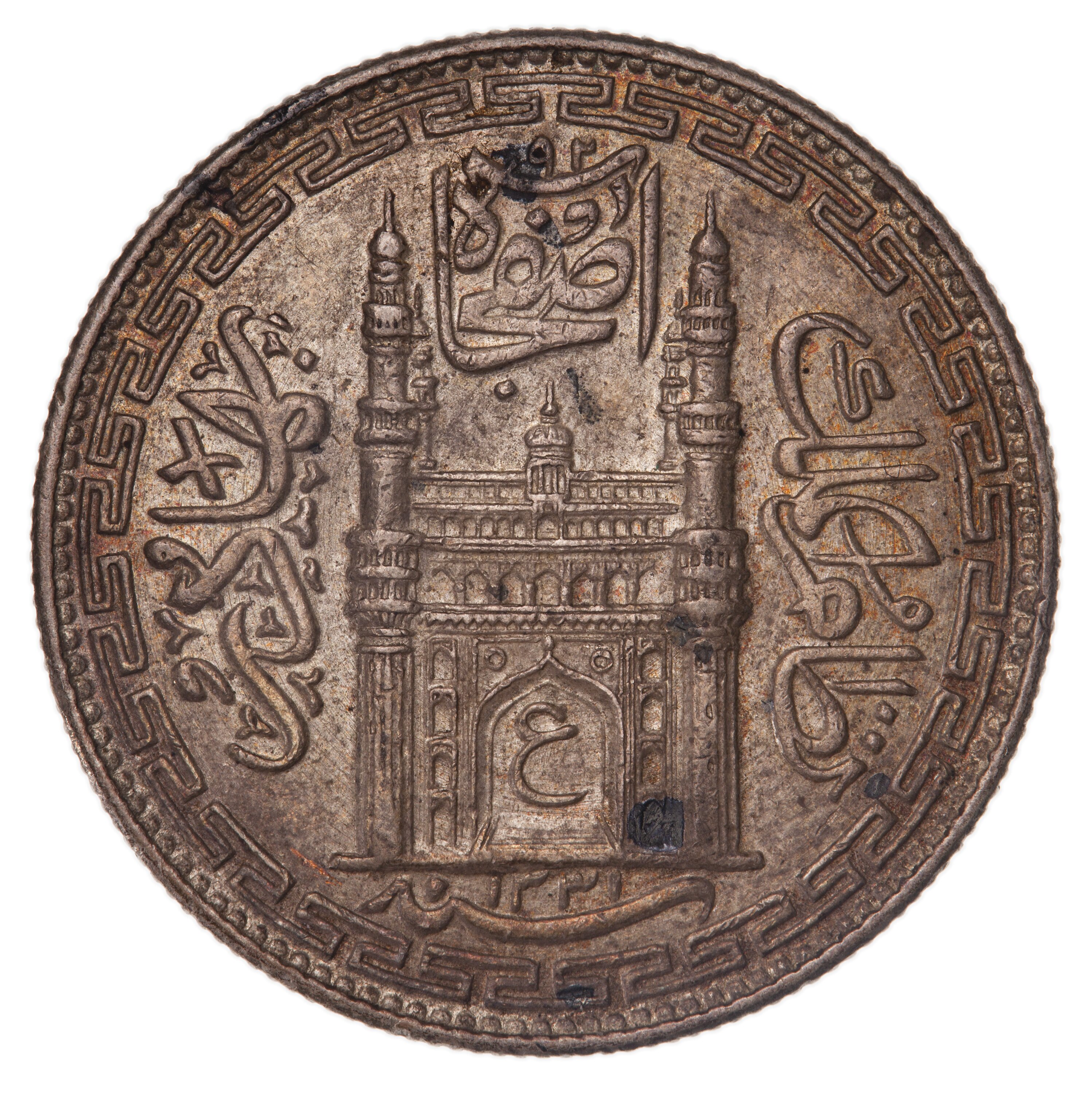 Chahar Minar Gateway with two minarettes; around, a Persian legend, the Hijera date 1331 below gate.