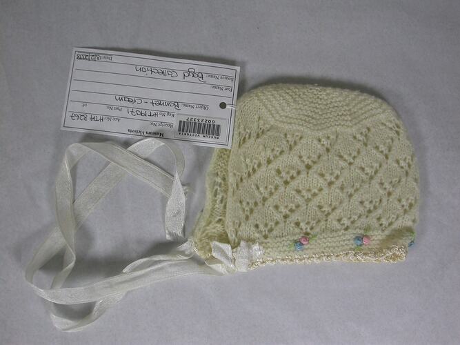 Cream knitted bonnet. Used and owned by Bill Boyd in the 1950s.