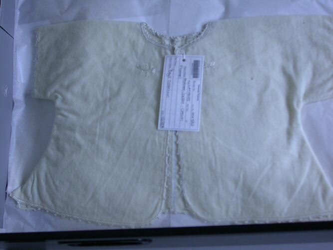 Cream flannel matinee jacket with embroidered edging and two buttons.