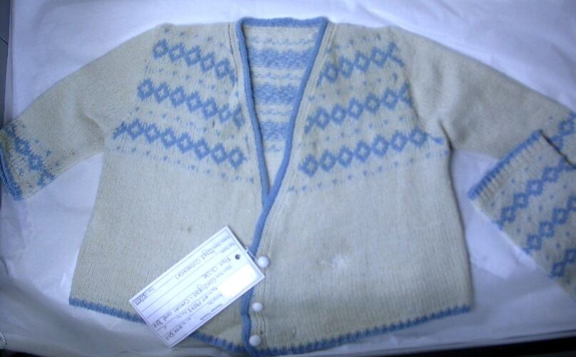 Cardigan of cream and blue knitted wool. Worn by Bill Boyd in the late 1940s.