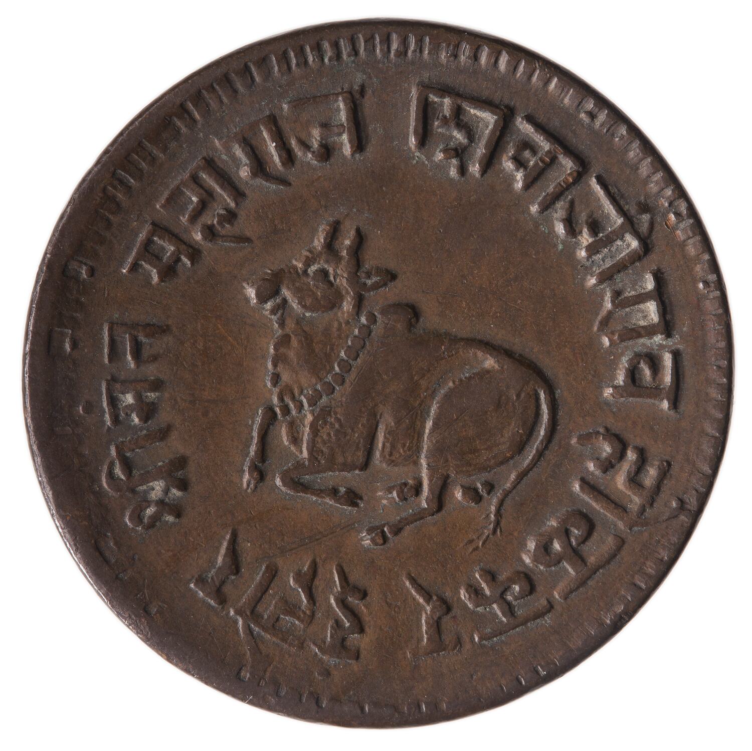 The arms of Indore includes an image of Nandi, the bull sacred to Shiva in a pose like that on this coin. The coin was issued by Shivaji Rao one of the Holkar rulers of Indore by whom Shiva was specially adored.