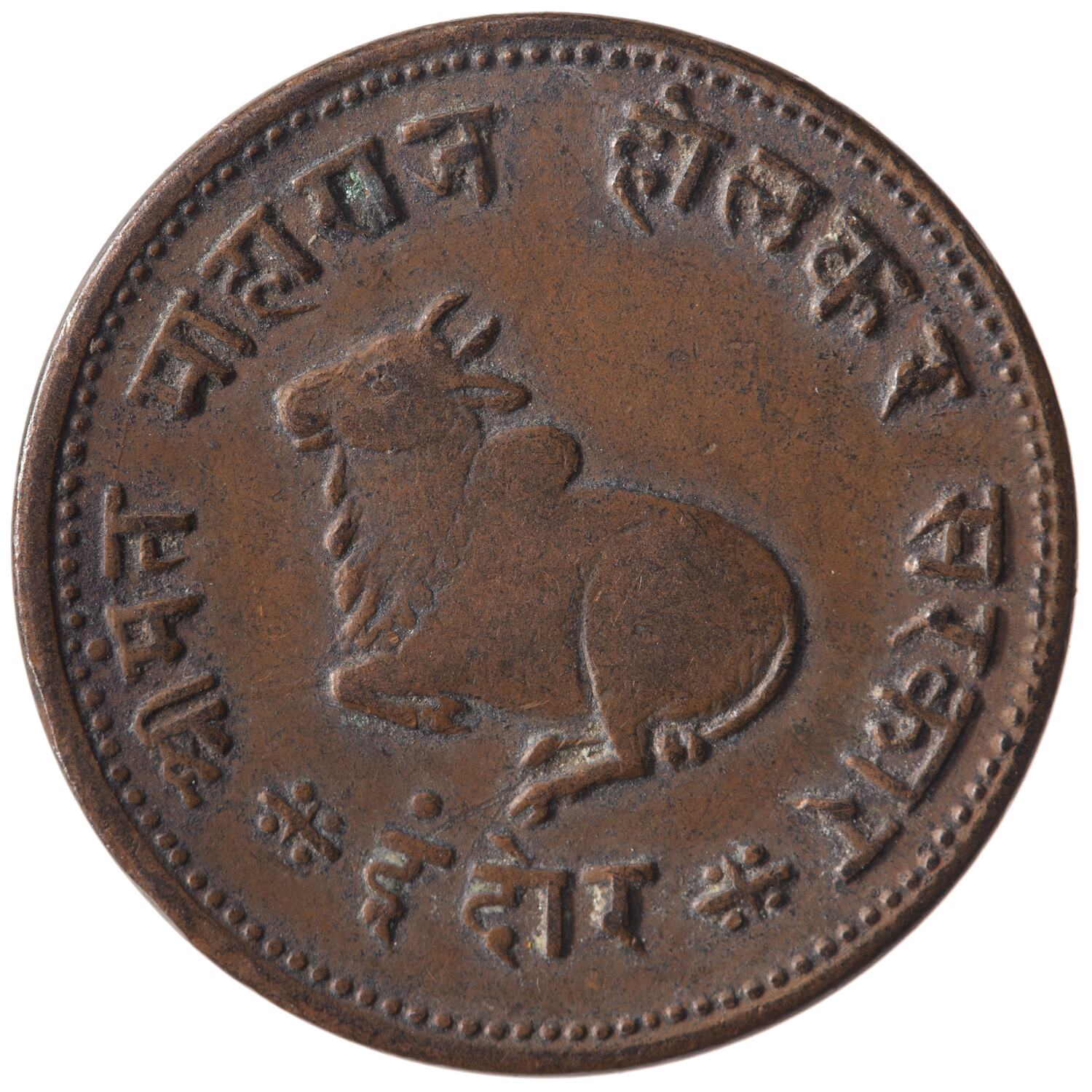 1/4 Anna coin, 1943 VS (1886-1887 AD) issued by Maharaja Shivaji Rao of the Indore Princely State, India.