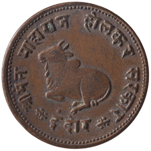 The arms of Indore includes an image of Nandi, the bull sacred to Shiva in a pose like that on this coin. The coin was issued by Shivaji Rao one of the Holkar rulers of Indore by whom Shiva was specially adored.