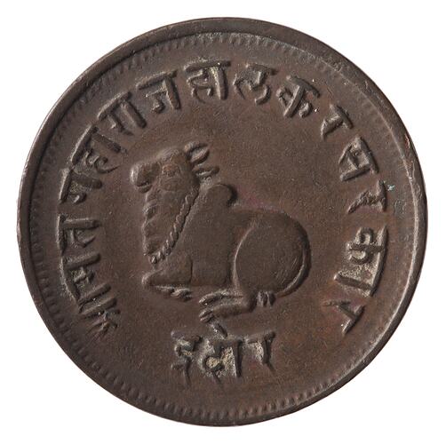 The arms of Indore includes an image of Nandi, the bull sacred to Shiva in a pose like that on this coin. The coin was issued by Shivaji Rao one of the Holkar rulers of Indore by whom Shiva was specially adored.