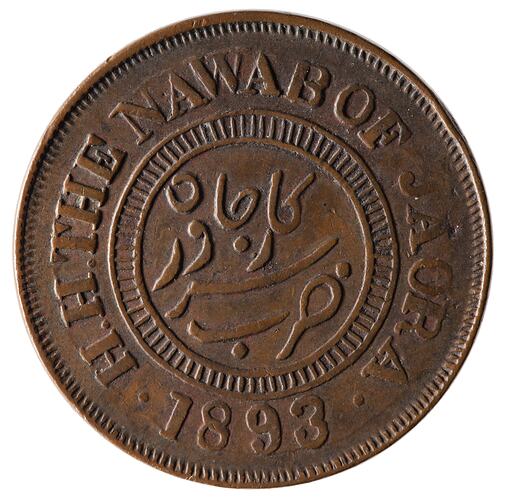 At the centre, a legend in Persian script; around, H.H. THE NAWAB OF JAORA .1893. (AD)