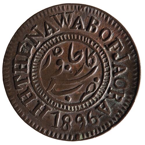 At the centre, a legend in Persian script; around, H.H. THE NAWAB OF JAORA .1896. (AD)