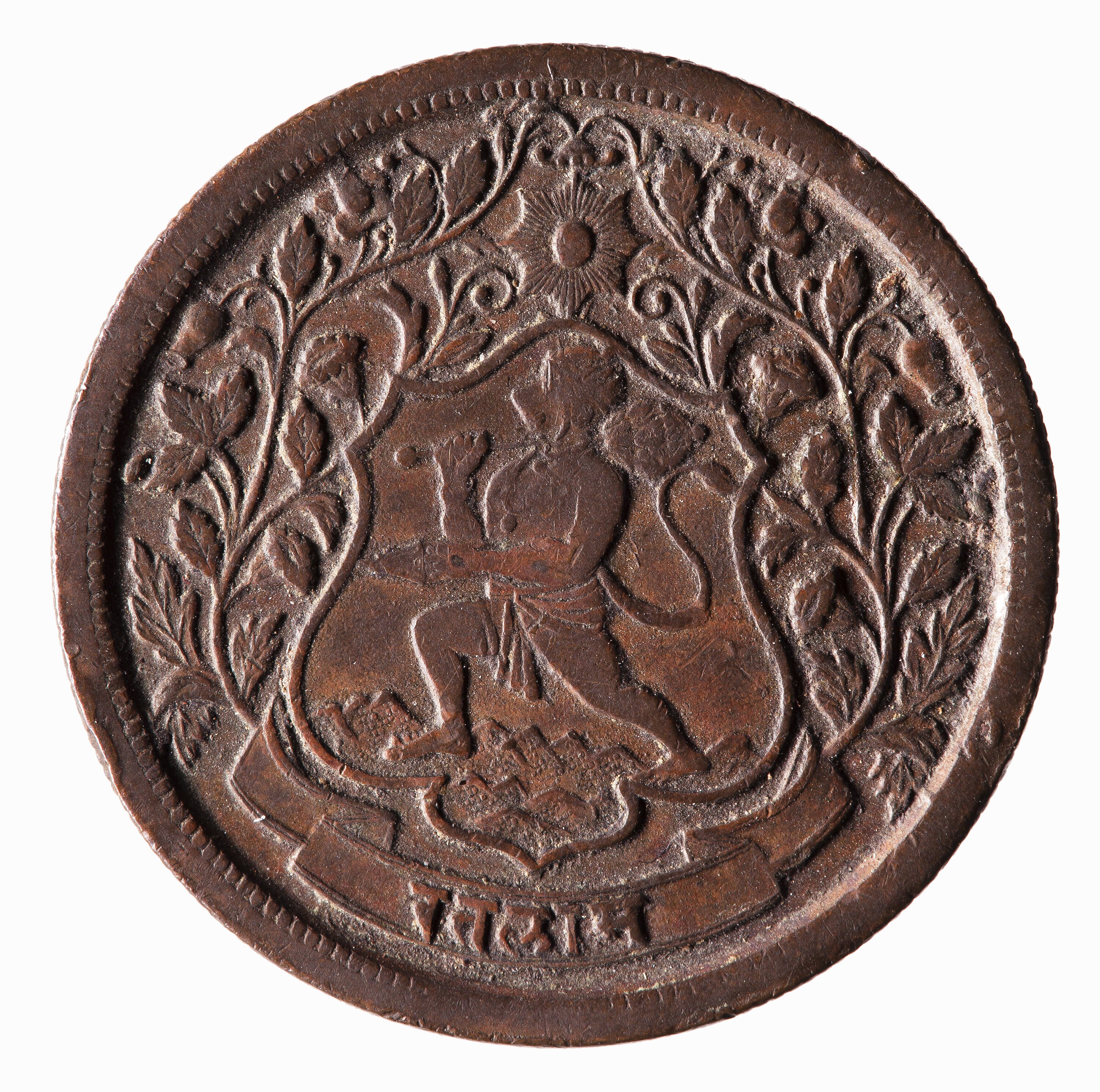 The obverse, featuring the Hindu god Hanuman, is derived from the Ratlam coat of arms.