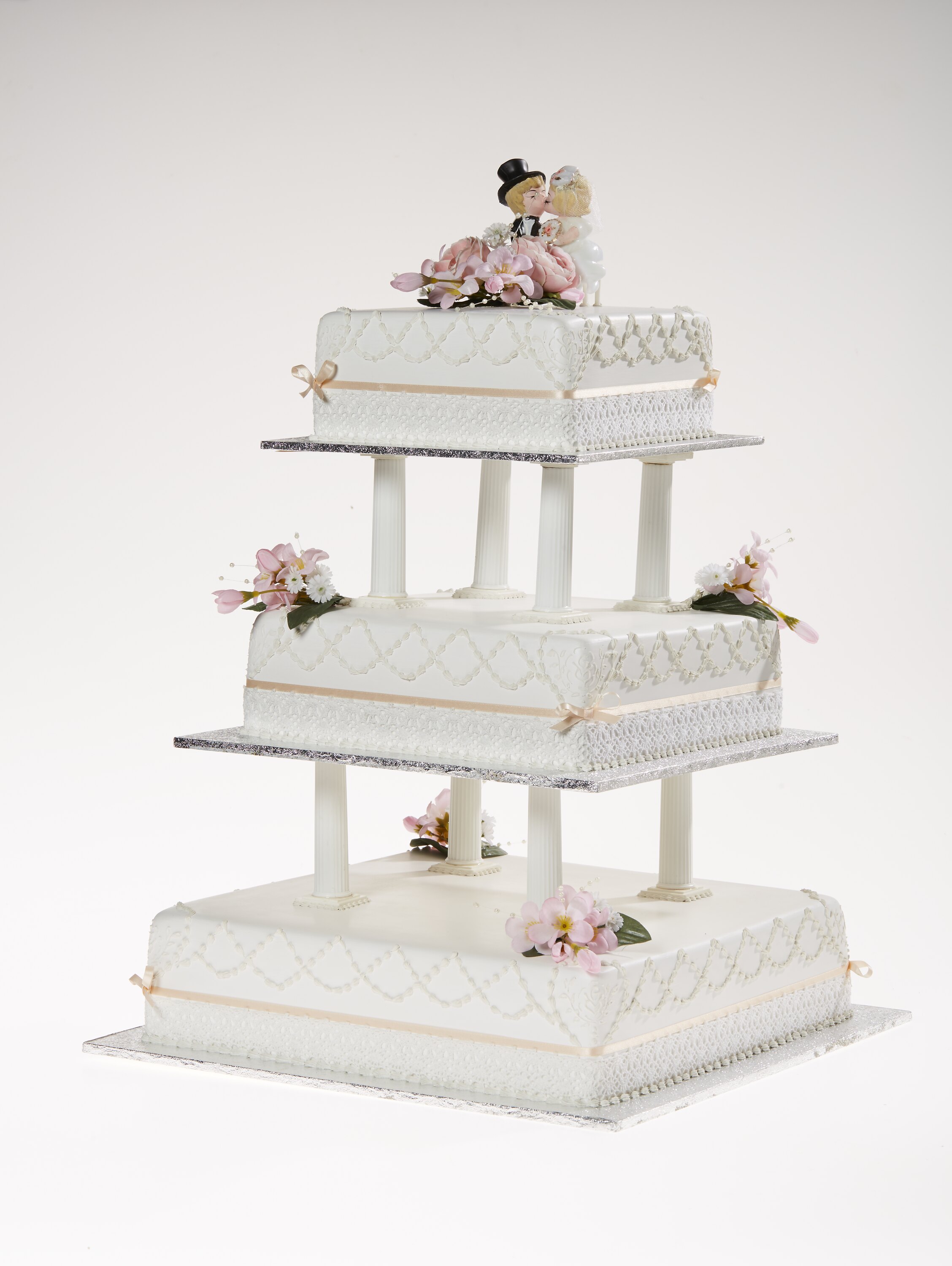 The model consists of three square cake tiers, constructed of an unknown synthetic material, with the two top tiers sitting on four plastic cake columns. Each tier sits on a foil-covered board, and is decorated with an band of apricot ribbon tied in a bow (to match the bride's dress) and a posey of fabric flowers. On the top of the cake are cartoon-style figures of a bride and groom sitting on a bench kissing.