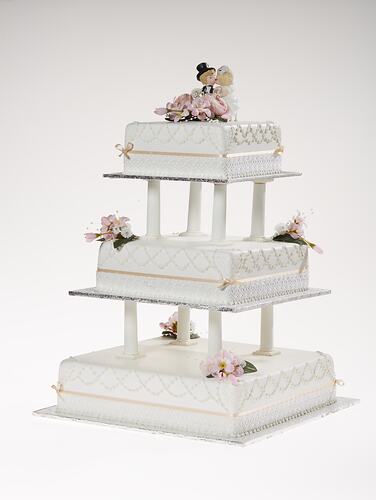 Model wedding cake made in 2000 by David O'Grady for inclusion in the inaugural Melbourne exhibition at Melbourne Museum. It is a replica of the cake used in the Neighbours TV series in 1987 during the episodes involving the wedding of Scott Robinson and Charlene Mitchell, with some enhancements due to the fact that the cake would be seen close-up, rather than fleetingly on screen.