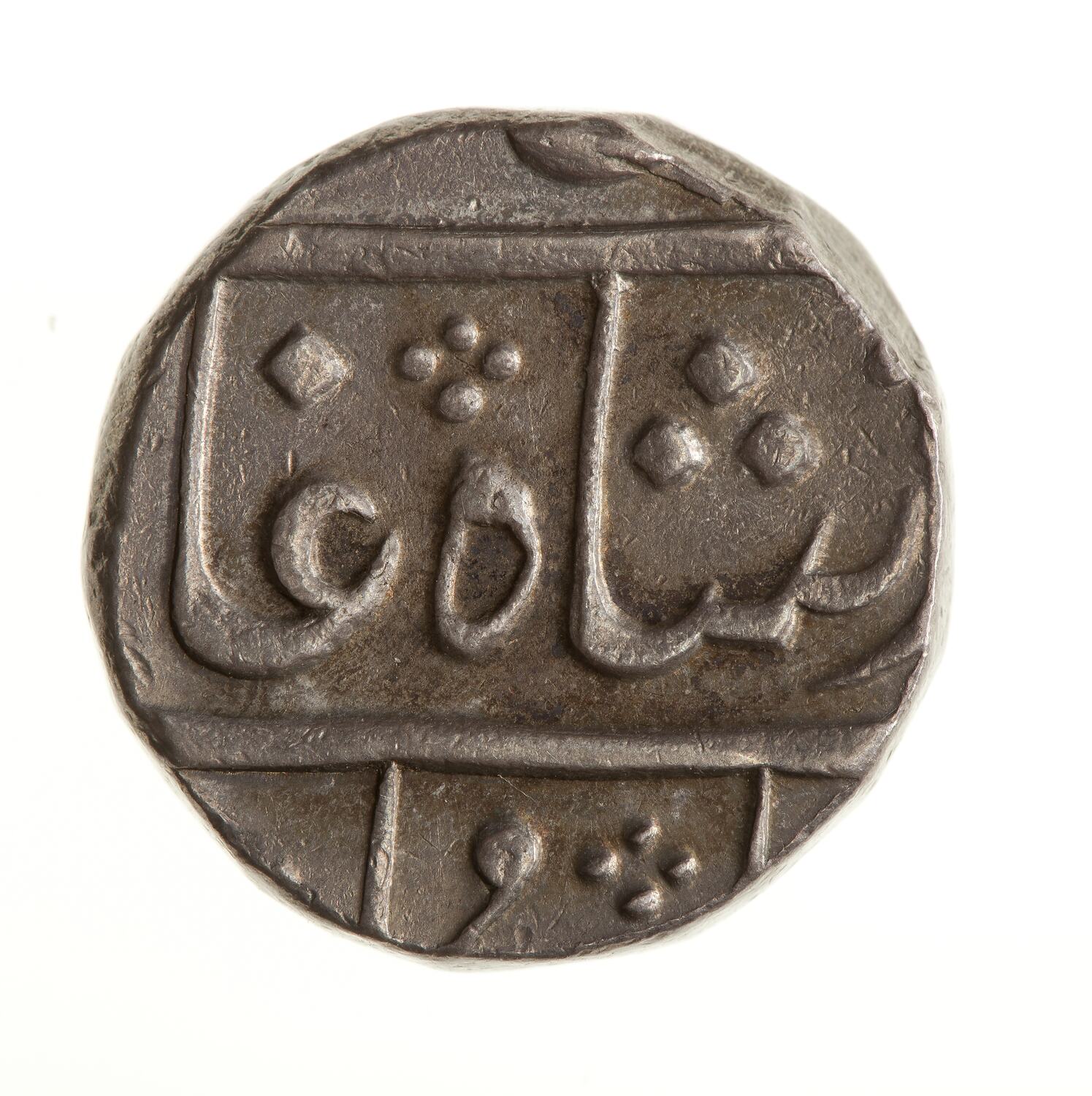 Legend in Persian script, much off flan (full legend translation: The auspicious coin of the Victorious Emperor Shah Alam)