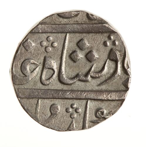 Legend in Persian script, much off flan (full legend translation: The auspicious coin of the Victorious Emperor Shah Alam)