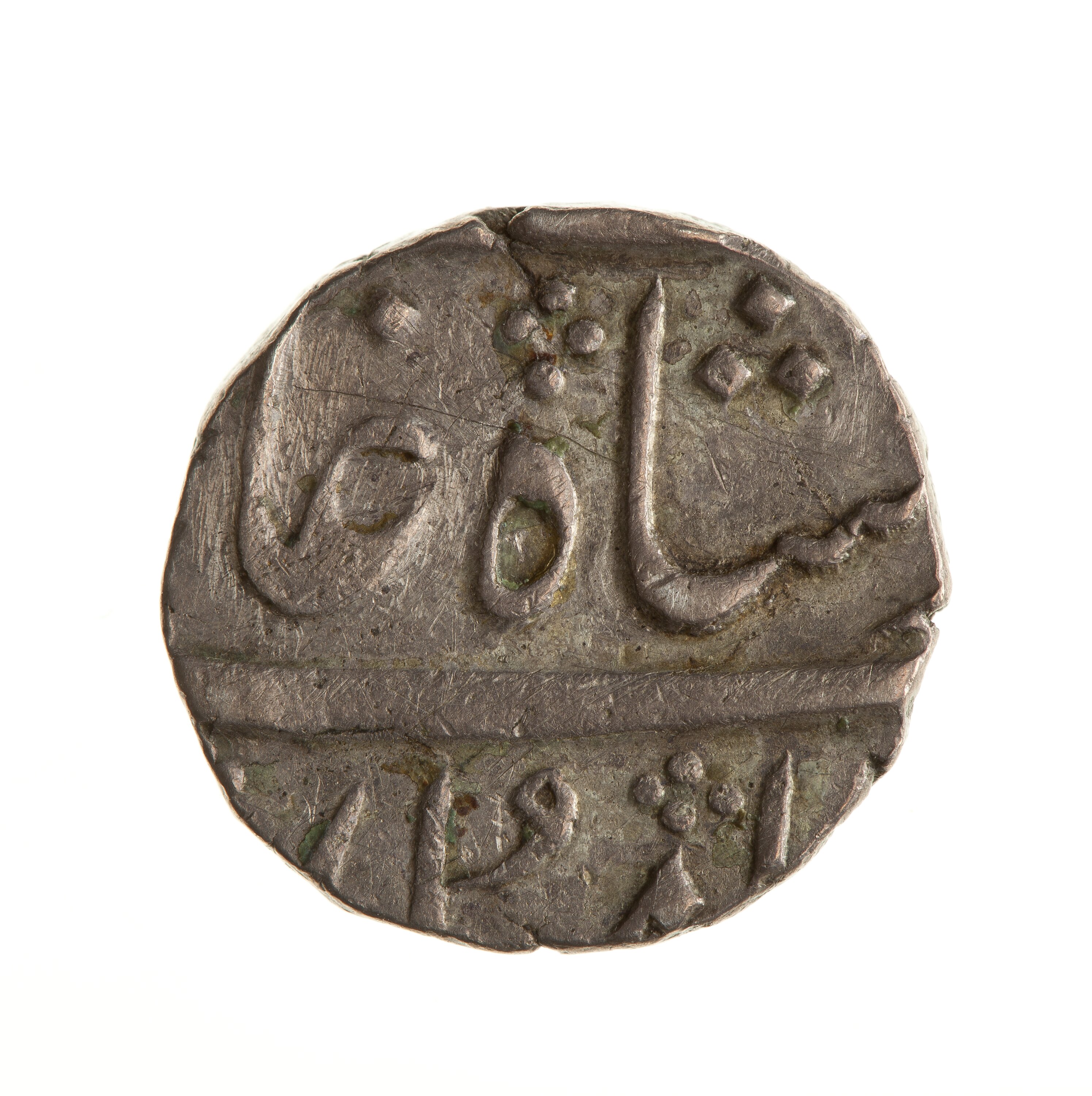 Legend in Persian script, much off flan (full legend translation: The auspicious coin of the Victorious Emperor Shah Alam)