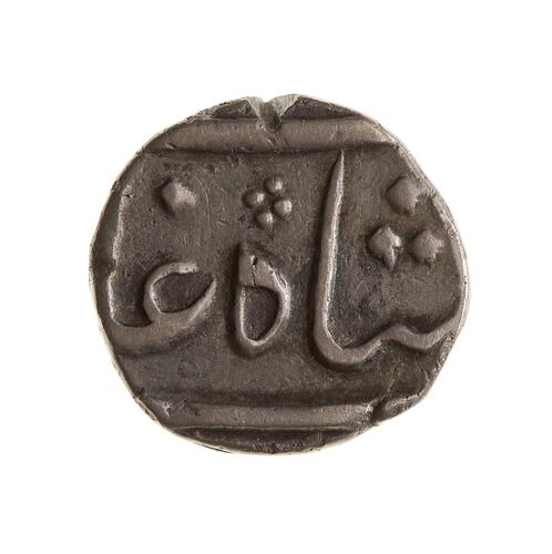 Legend in Persian script, much off flan (full legend translation: The auspicious coin of the Victorious Emperor Shah Alam)
