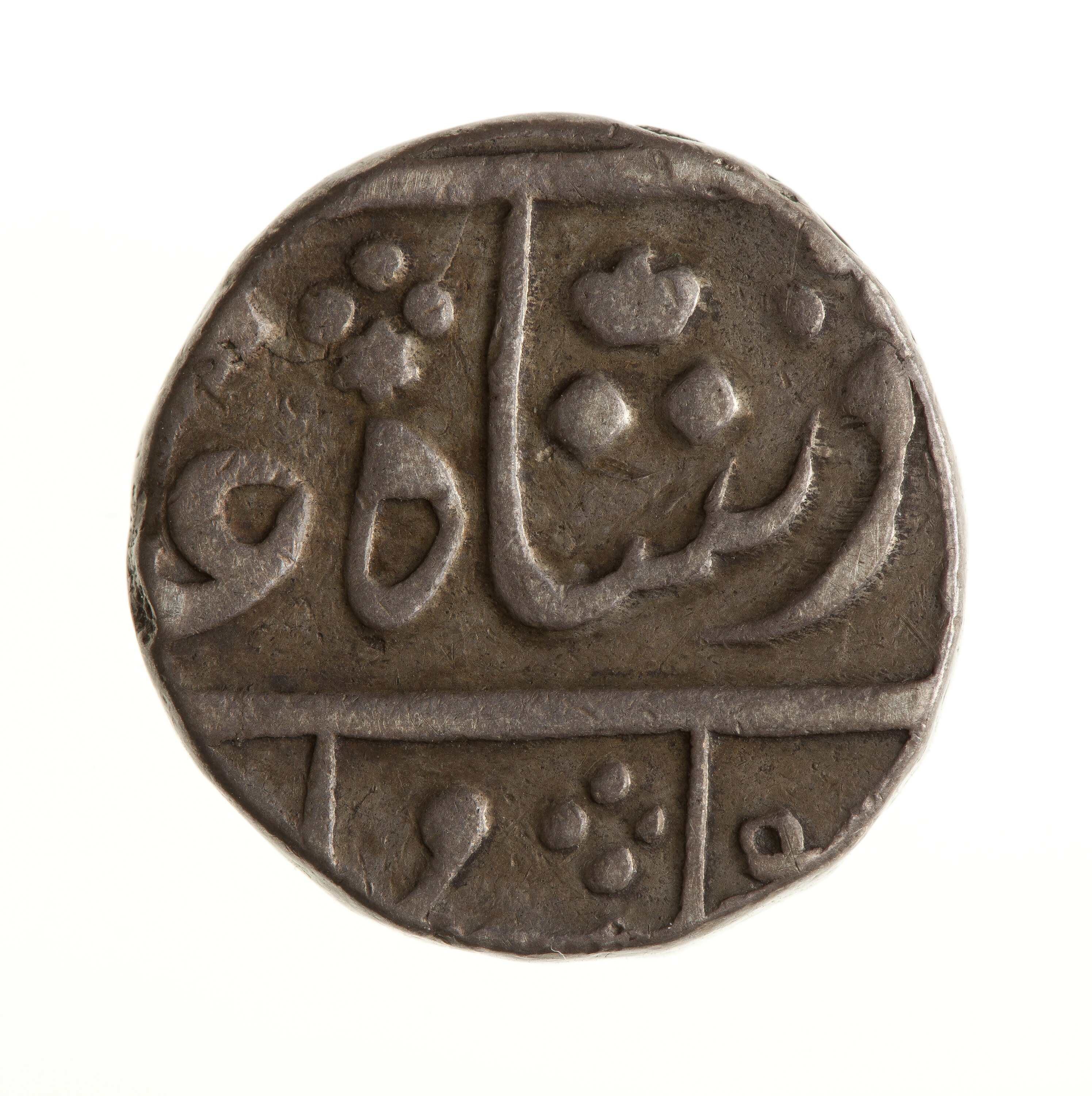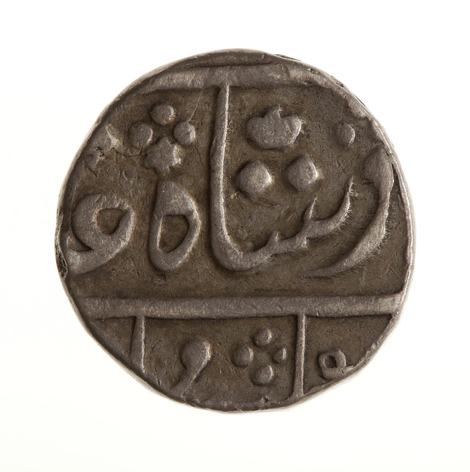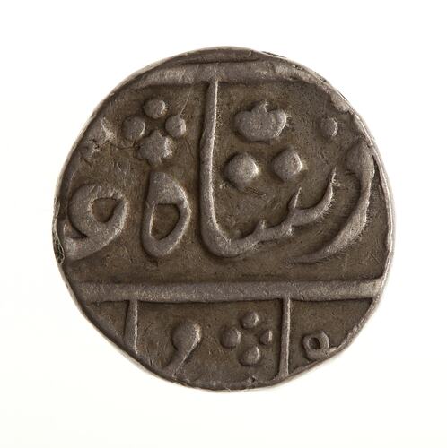 Legend in Persian script, much off flan (full legend translation: The auspicious coin of the Victorious Emperor Shah Alam)